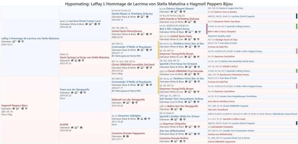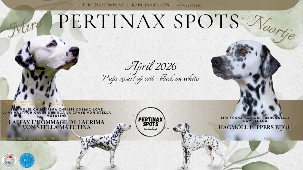 Begin februari heeft Noortje een vlotte en soepele ontmoeting gehad met Miro. Uit deze combinatie hopen we begin maart te kunnen bevestigen dat begin april een prachtig nest zwart op wit gevlekte pups zal worden geboren.
